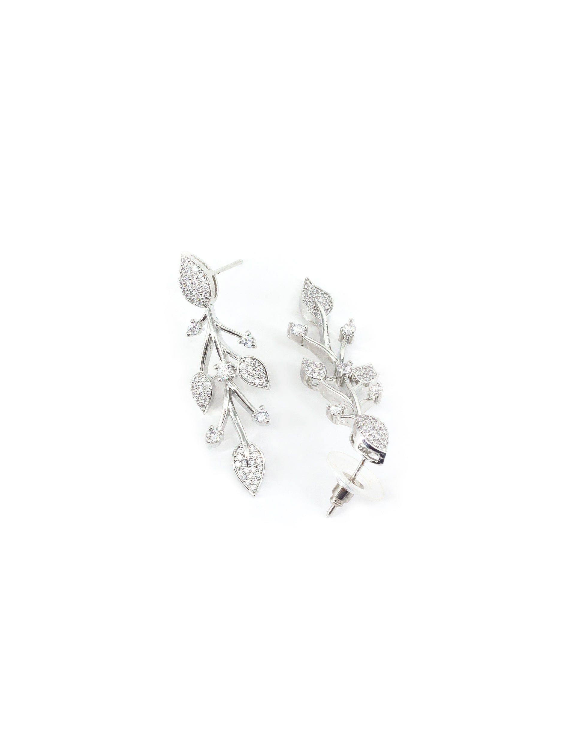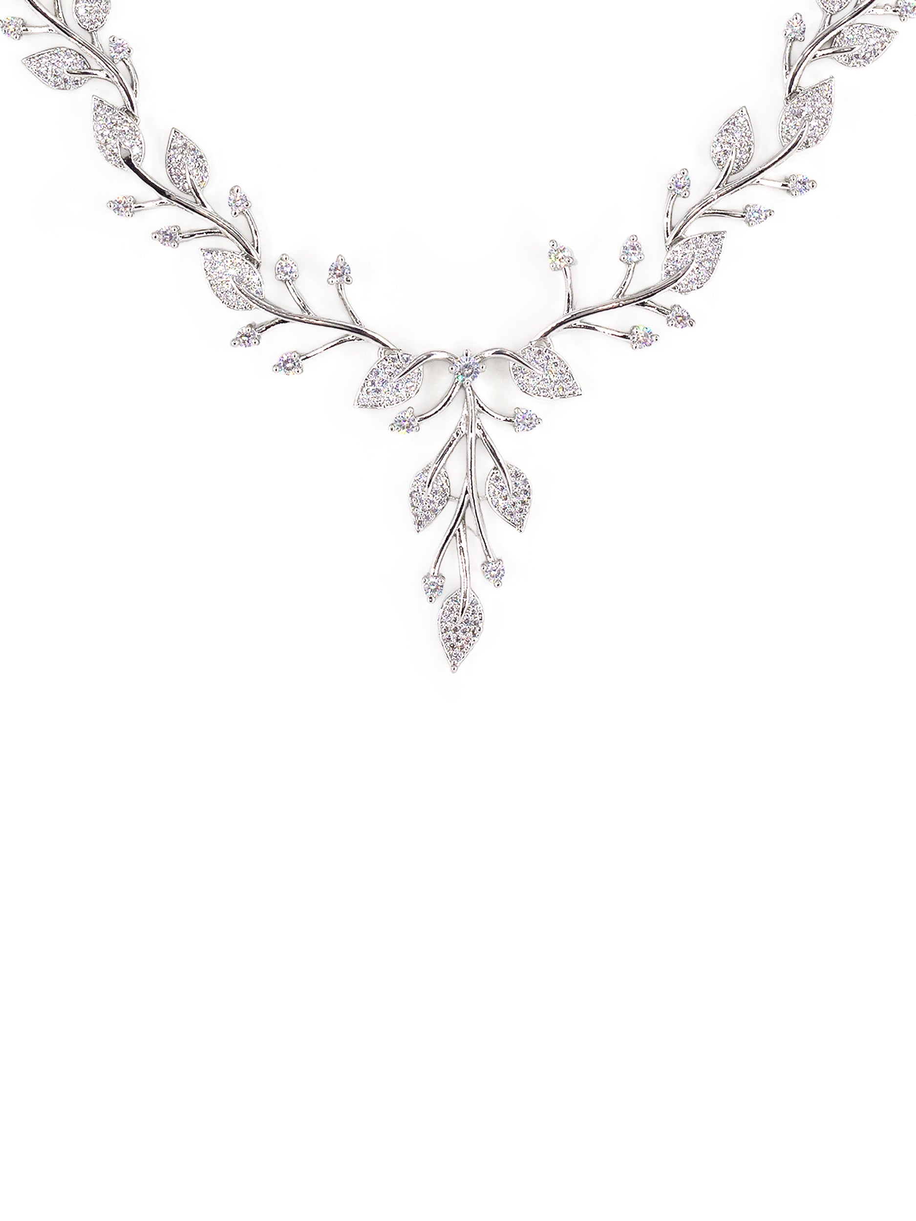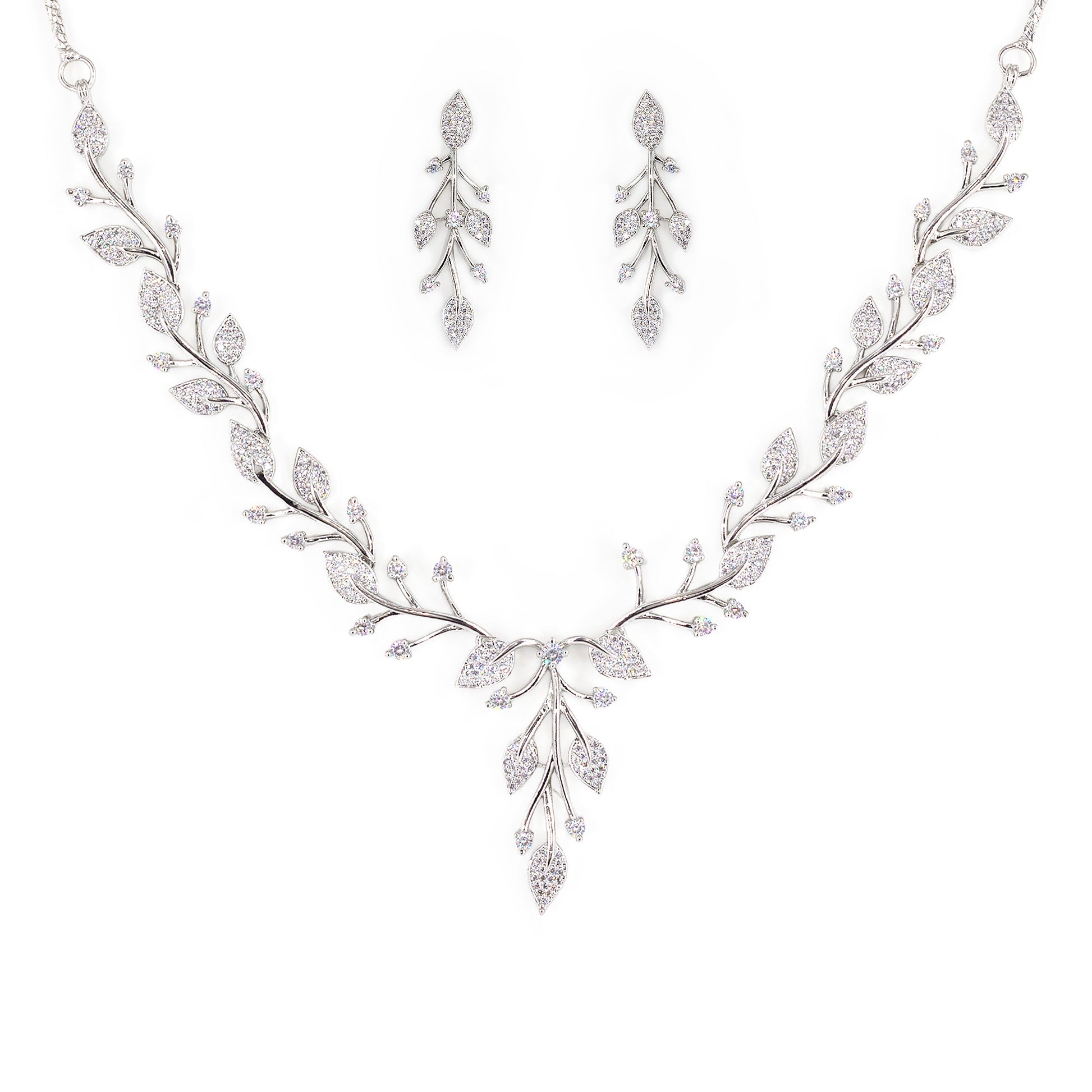 Silver Plated White AD Leaf Designer Jewellery Set secured with S-Hook Closure and Earrings with Post & Back Closure.