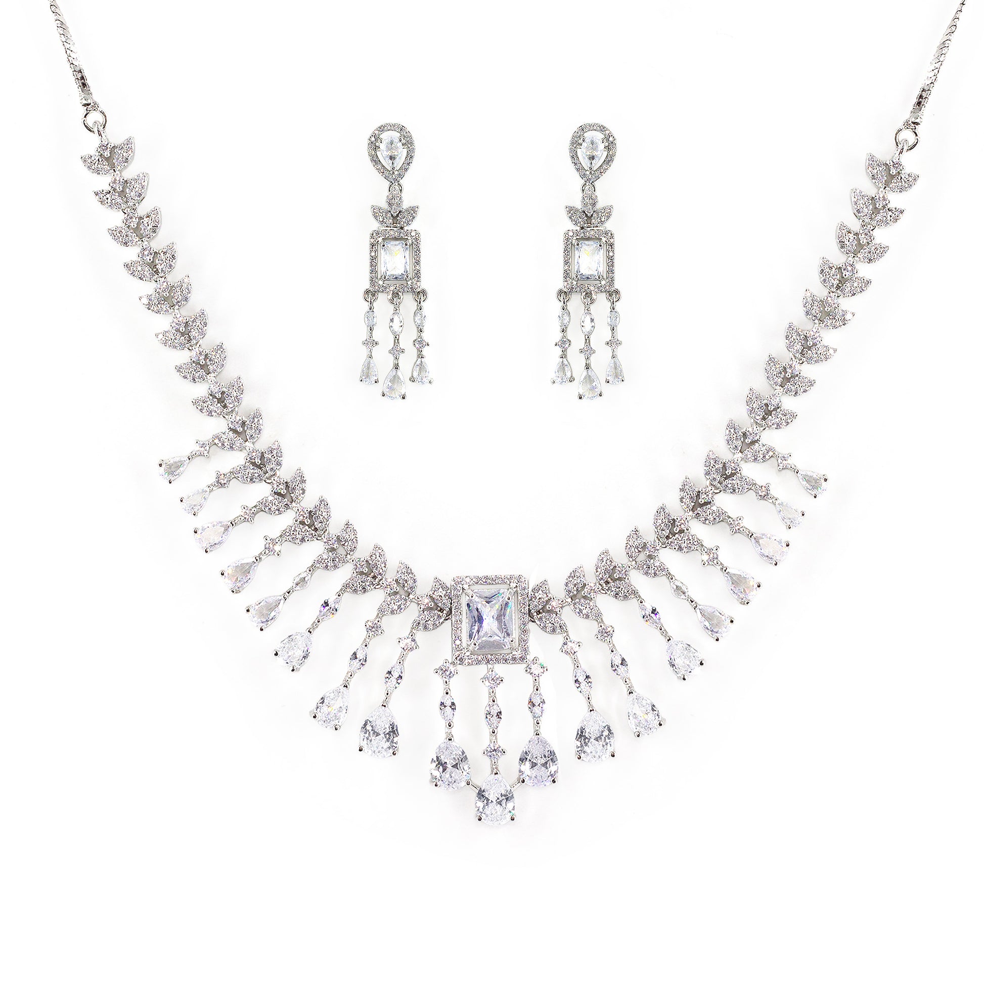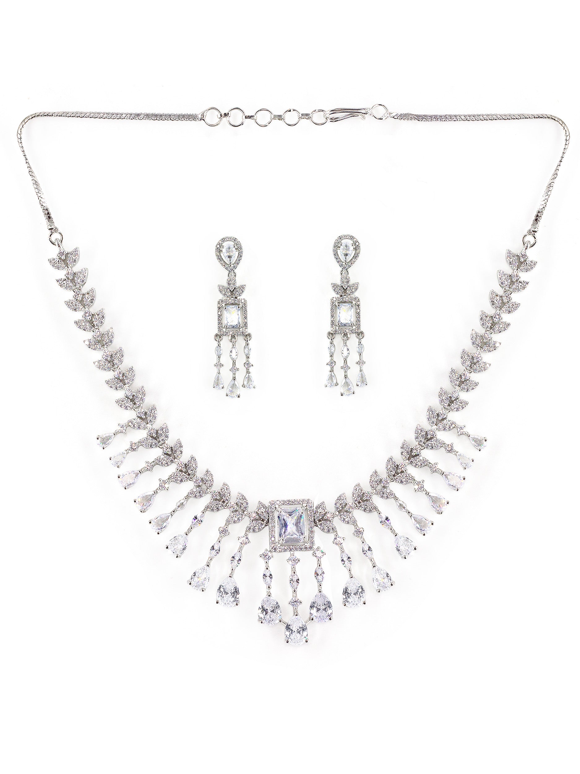 Silver Plated White American Diamond Studded Jewellery Set secured with S-hook Closure and Earrings with Post & Back Closure.