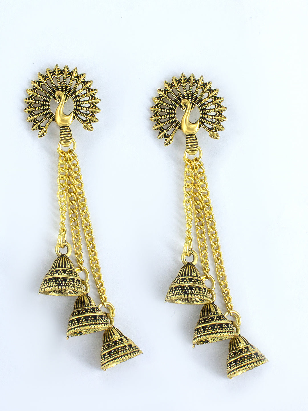 These earrings are gold plated, has multi layered jhumka details and secured with post and back closure.